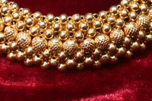 The Suvarna Maal Thusi is the epitome of pure tradition and grandeur. Designed with closely-knit layers of polished golden beads, this classic Maharashtrian thusi stands out with its rich texture and bold presence. With no central pendant, the beauty of this piece lies in its flawless symmetry and timeless appeal.